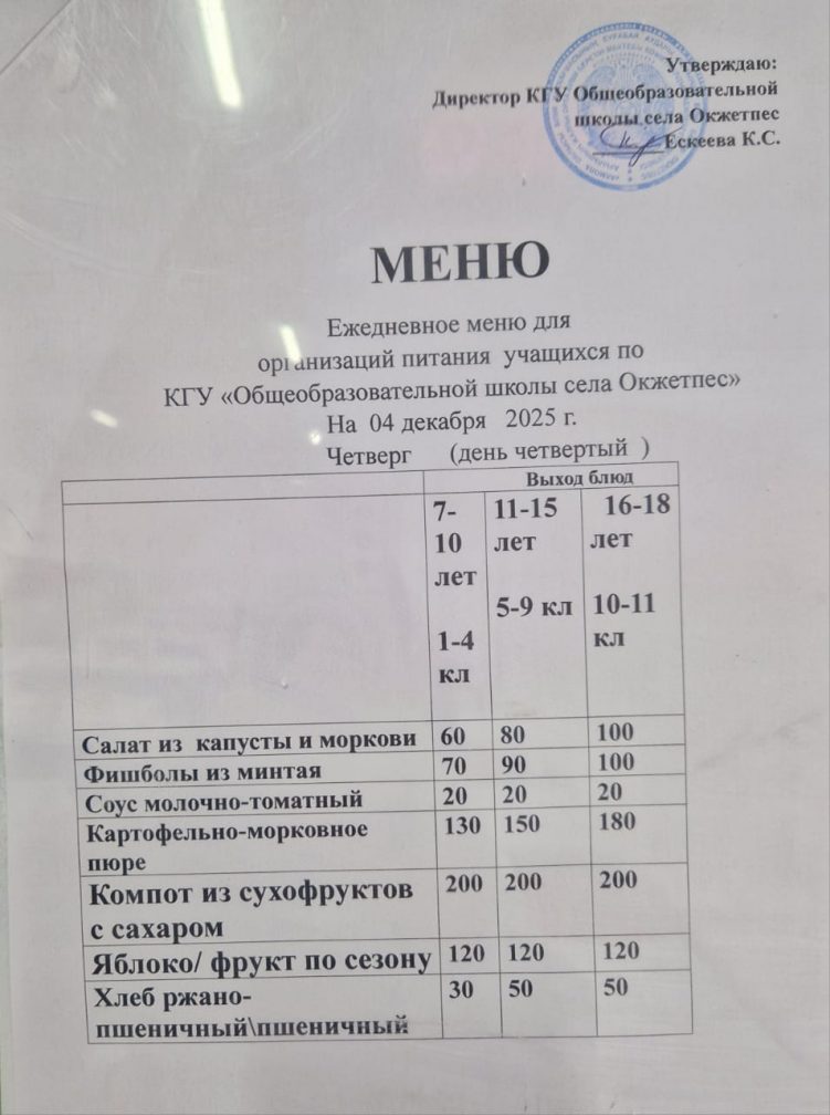 Оқушылардың күнделікті мәзірі 04.12.25г