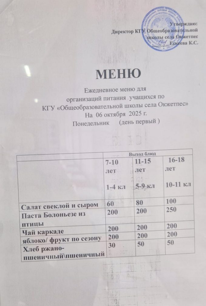 Оқұшыларға арналған күнделікті ас мәзірі 06.10.25ж