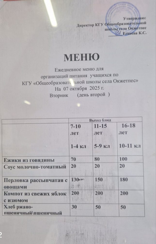 Оқұшыларға арналған күнделікті ас мәзірі 07.10.25ж