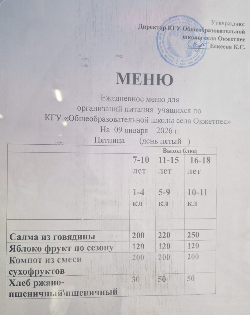 Оқұшыларға арналған күнделікті ас мәзірі 09.01.2026ж