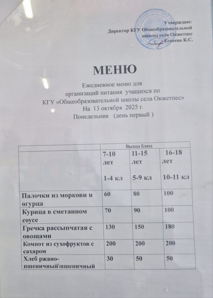Оқұшыларға арналған күнделікті ас мәзірі 11.10.25ж