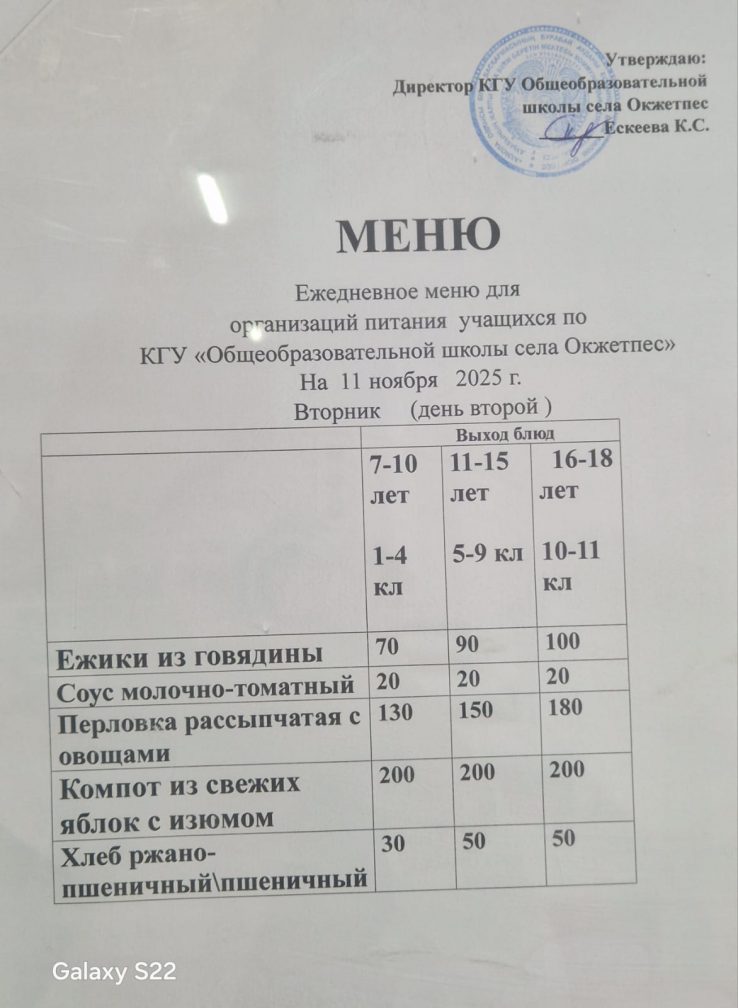 Оқушылардың күнделікті мәзірі 11.11.25г