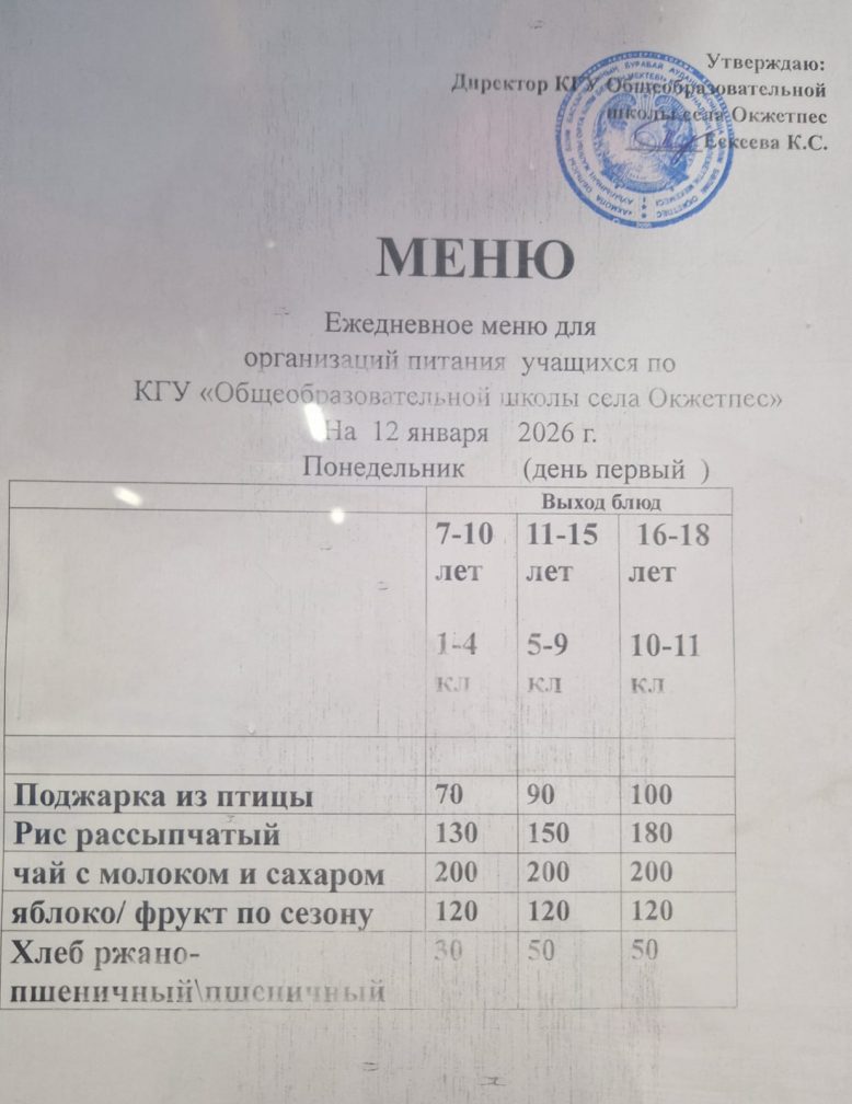 Оқұшыларға арналған күнделікті ас мәзірі 12.01.2026ж