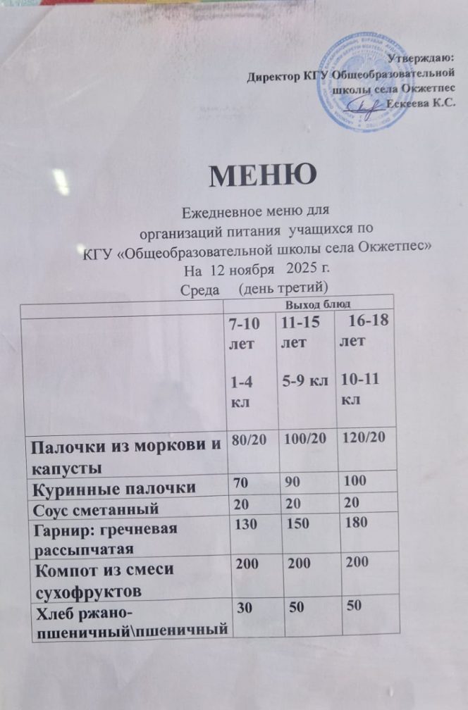 Оқушылардың күнделікті мәзірі 12.11.25г