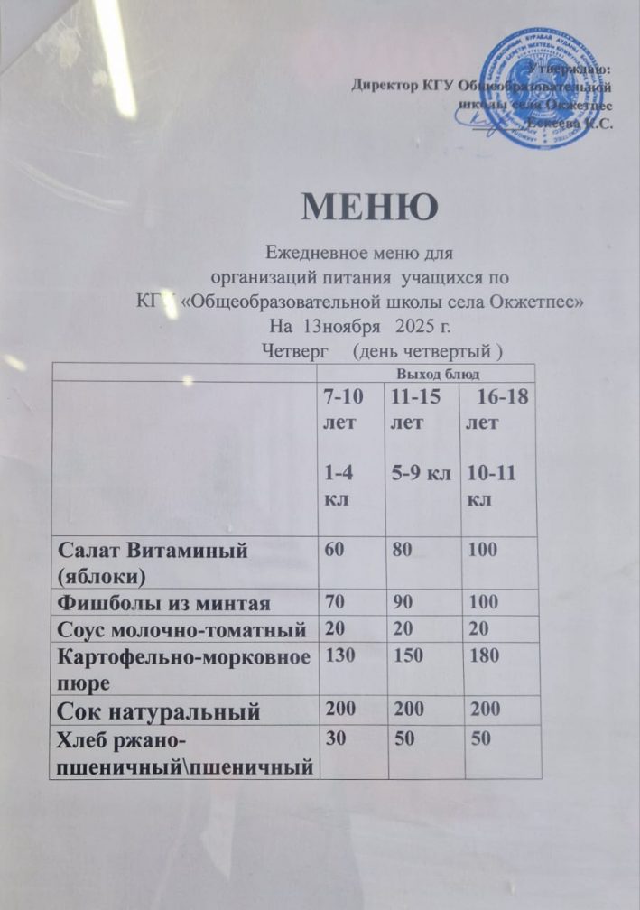Оқушылардың күнделікті мәзірі 13.11.25г