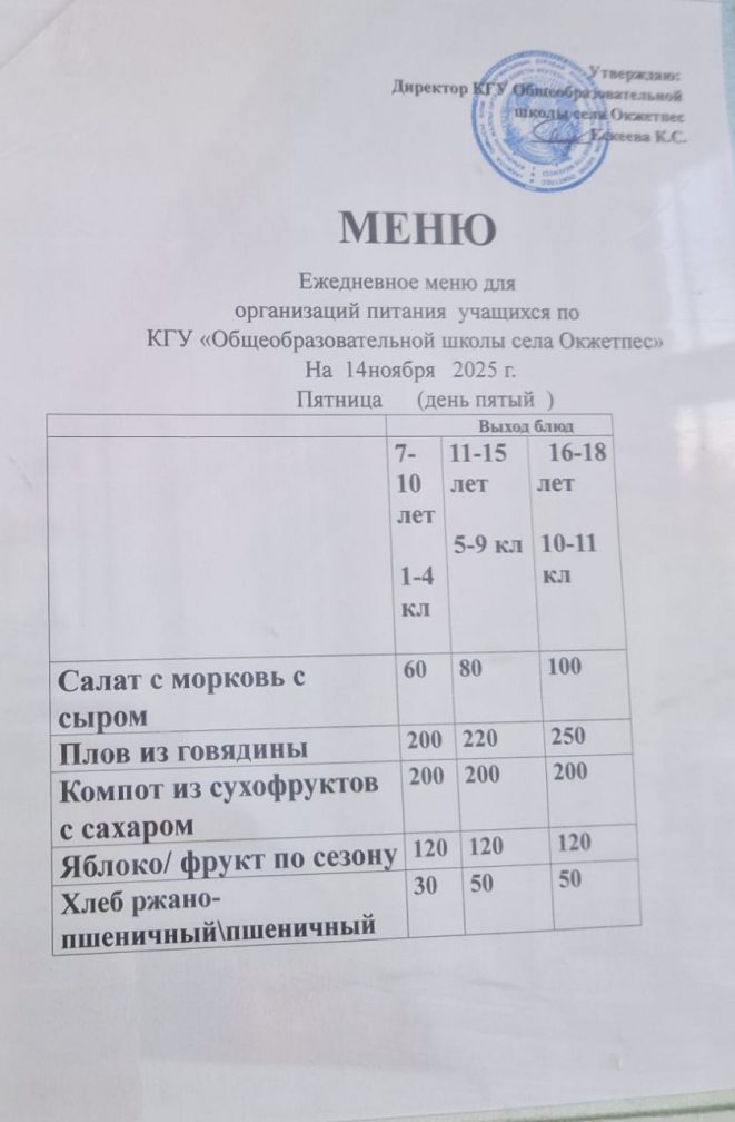 Оқушылардың күнделікті мәзірі 14.11.25г