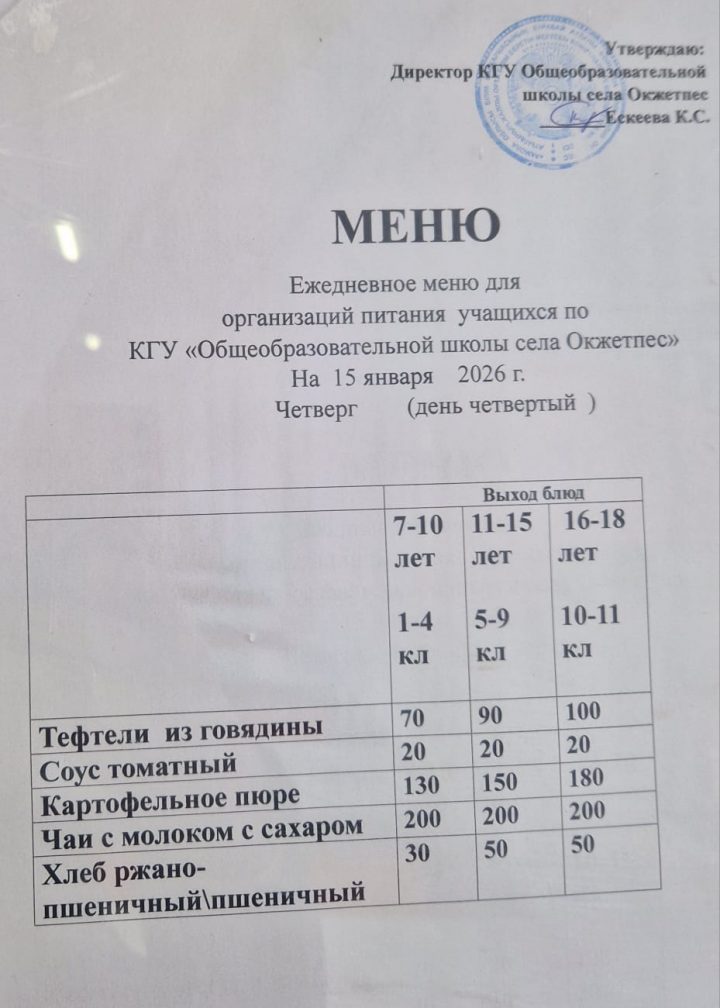 Оқұшыларға арналған күнделікті ас мәзірі 15.01.2026ж