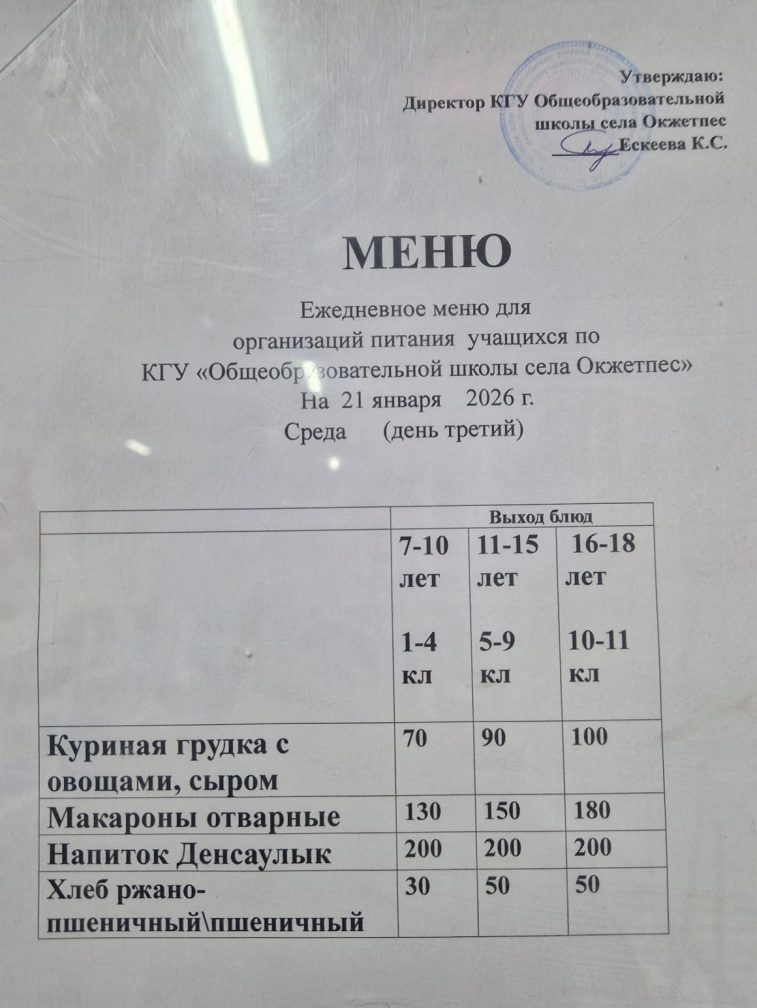 Оқұшыларға арналған күнделікті ас мәзірі 21.01.26г