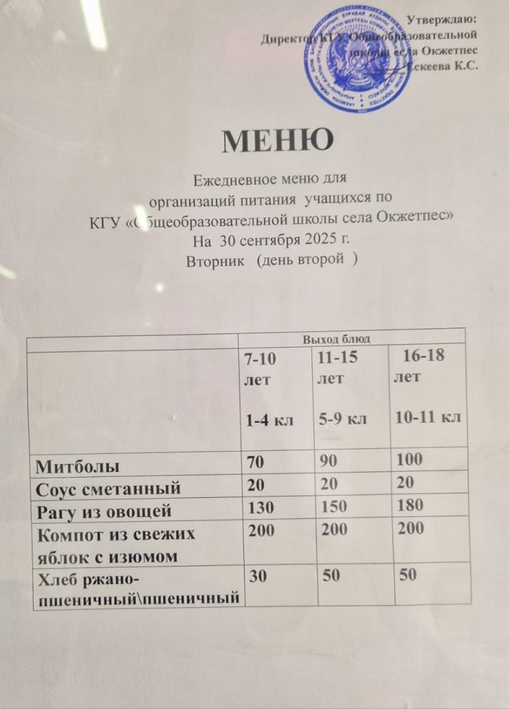 Оқұшыларға арналған күнделікті ас мәзірі 30.09.25ж