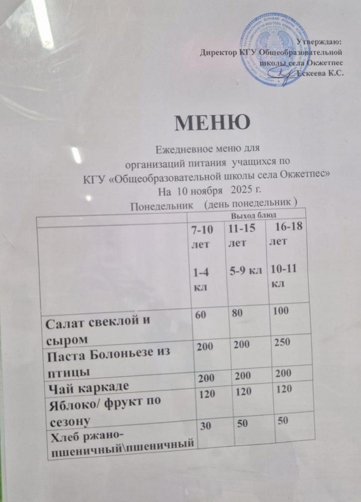 Оқушылардың күнделікті мәзірі 10.11.25г