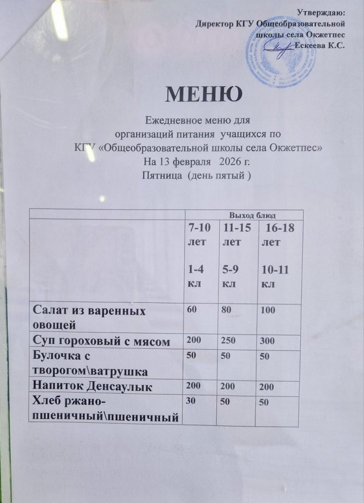 Оқұшыларға арналған күнделікті ас мәзірі 13.02.26ж