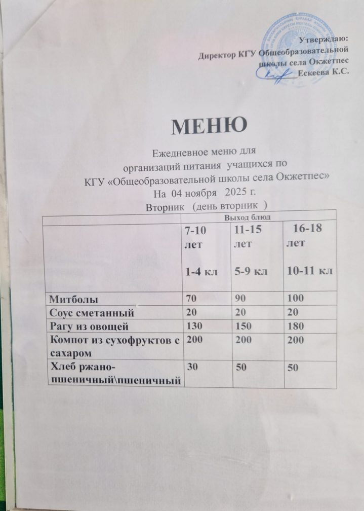 Оқушылардың күнделікті мәзірі 04.11.25г
