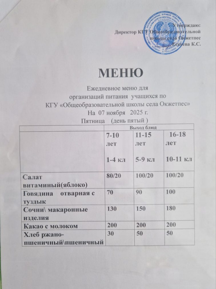 Оқушылардың күнделікті мәзірі 07.11.25г