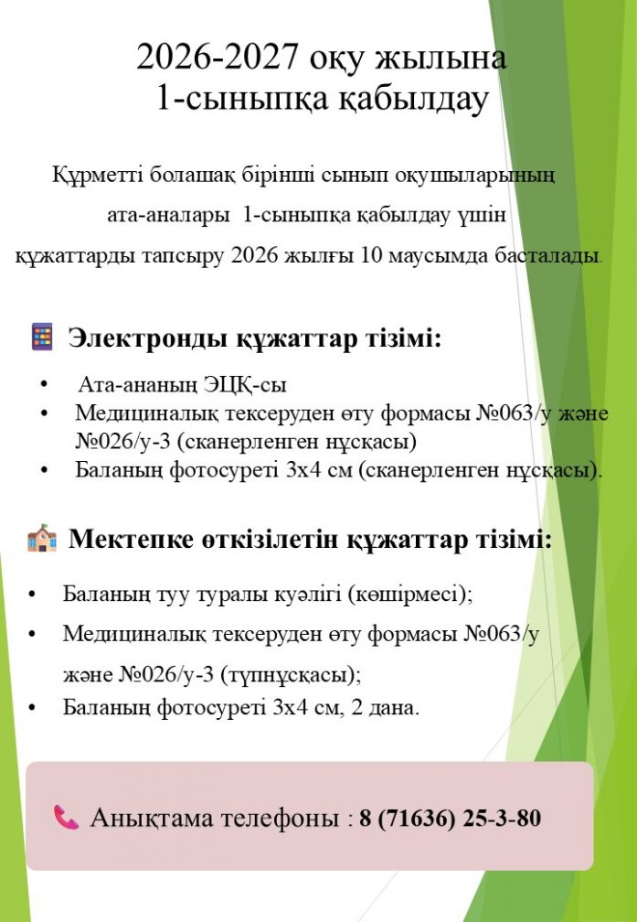 1-сыныпқа қабылдау үшін құжаттарды тапсыру 2026 жылғы 10 маусымнан басталады